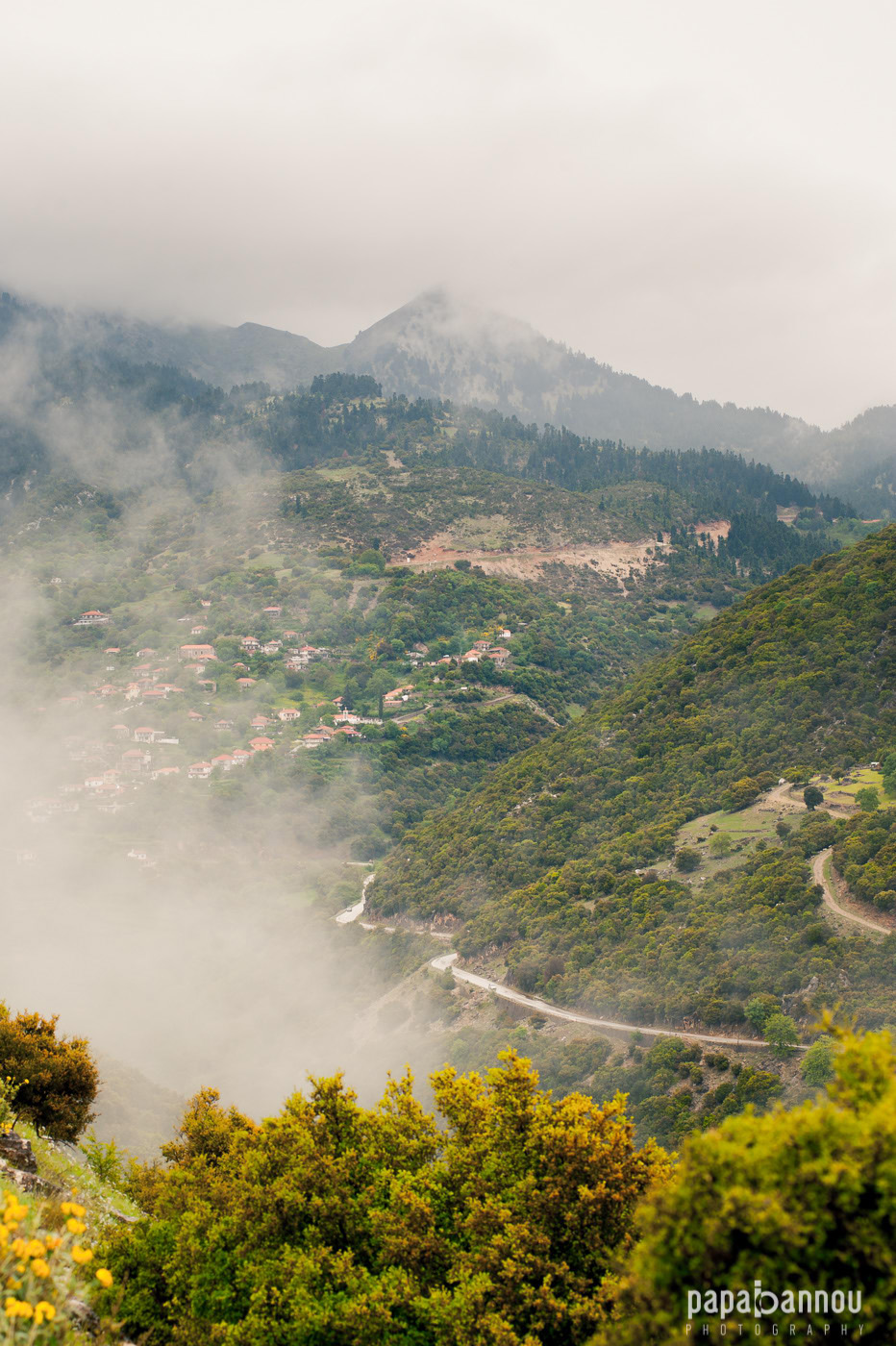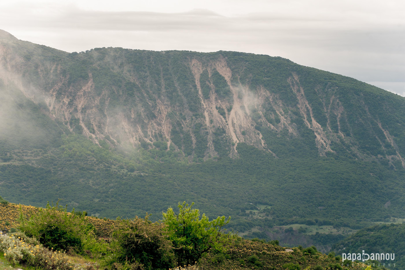 Θυμήθηκα τον μύθο, προσπάθησα να τον ταιριάξω στο σήμερα, ο καιρός ήταν ο κατάλληλος. Άγρια ομορφιά, βροχερή μέρα, έσμιγε ο ουρανός με τη γη – σφίγγεται η ψυχή του ανθρώπου λένε όταν βρέχει, γιατί νοιώθει την παρουσία του Θεού. Ο ήλιος είχε κρυφτεί, τα πάντα μουσκεμένα γύρω μου, τα χρώματα ζωντένεψαν στα βρεγμένα φύλλα, στο φρέσκο χορτάρι, στα λιγοστά αγριολούλουδα και τις φτέρες. Ανέβηκα μέχρι τη Δίβρη, δεν ήθελα να χάσω αυτήν την εναλλαγή, ήθελα να μείνω όσο περισσότερο γινόταν μέσα σ’ αυτό το μαγικό μπαλκόνι γης, που μπορεί να σε ταξιδέψει στον χρόνο και στην μνήμη.