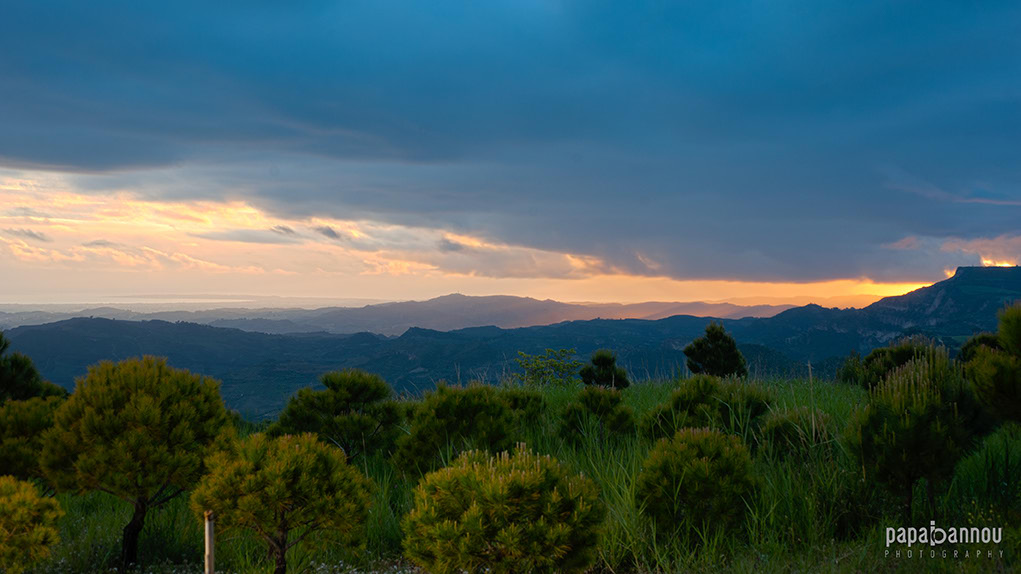 Κατεβαίνοντας πιά, σε μια στροφή του δρόμου, φάνηκε ο ήλιος μέσα από τα σύννεφα να πέφτει λυτρωτικός πάνω στον κάμπο. Σταμάτησα για να πάρω την τελευταία φωτογραφία. Το μάτι απλωνόταν από τα μικρά πεύκα που φύτεψαν για αναδάσωση, περνούσε από την Ολυμπία και έφτανε μέχρι το Κατάκωλο. Όρμησα στον κατήφορο. Σαν Κένταυρος που εξελίχθηκε: μισός άνθρωπος, μισός αυτοκίνητο….