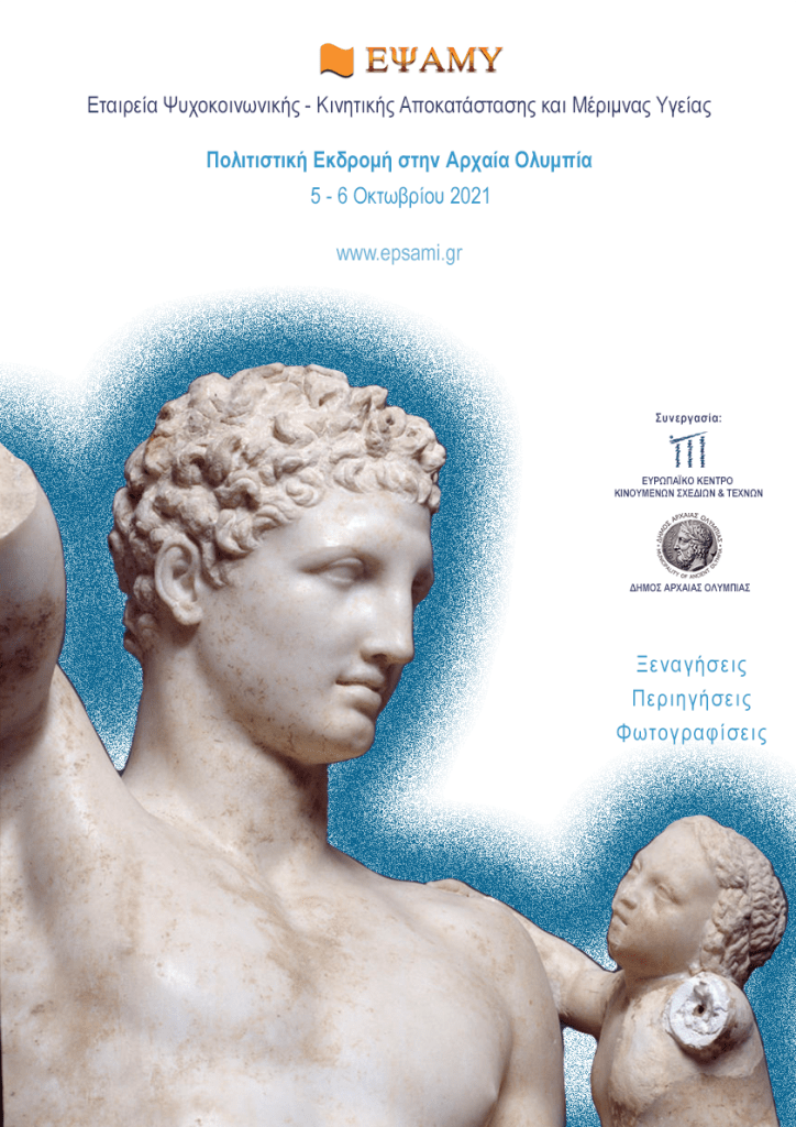 Το Διοικητικό Συμβούλιο της Εταιρίας Ψυχοκοινωνικής – Κινητικής Αποκατάστασης και Μέριμνας Υγείας, οργανώνει για τους ενοίκους της, διήμερη πολιτιστική εκδρομή στην Αρχαία Ολυμπία στις 5 -6 Οκτωβρίου 2021, με σκοπό να γνωρίσουν μέσα από ένα απλό και βιωματικό τρόπο τον τόπο που γεννήθηκαν οι Ολυμπιακοί Αγώνες.